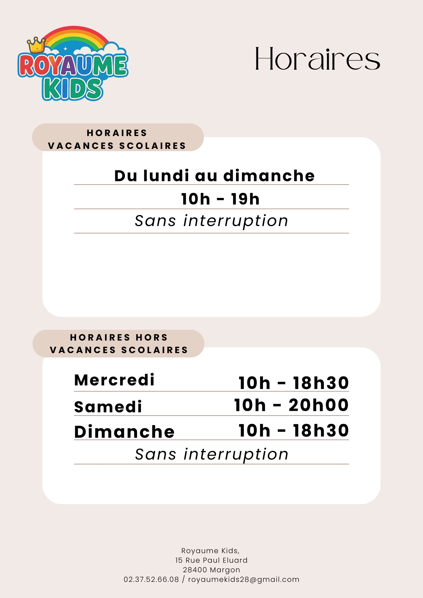 ROYAUME KIDS vous accueille tous les jours pendant les vacances scolaires et les jours fériés, de 10h à 19h. Venez vous amuser, quelle que soit la météo ! Et pour votre confort, le Wifi est disponible gratuitement dans tout le parc.