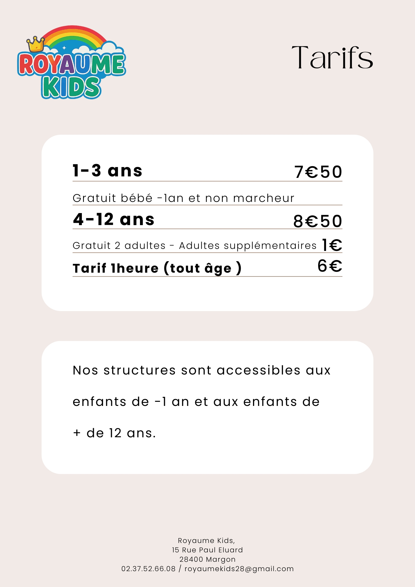 Bienvenue chez ROYAUME KIDS, un univers de divertissement pensé par des parents pour les enfants de 0 à 12 ans , dans un espace sécurisé, coloré et stimulant. Situé au 13-15 Rue Paul Éluard à Arcisses, notre parc de jeux indoor propose des structures modernes et des activités adaptées à tous les âges pour une expérience inoubliable dans un espace entièrement climatisé & chauffé. Nous vous accueillons par tous les temps !
